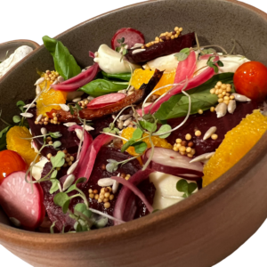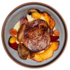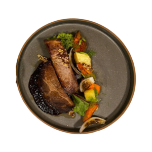 Bondiola de cerdo braseada, reducción de ciruelas y vegetales grillados