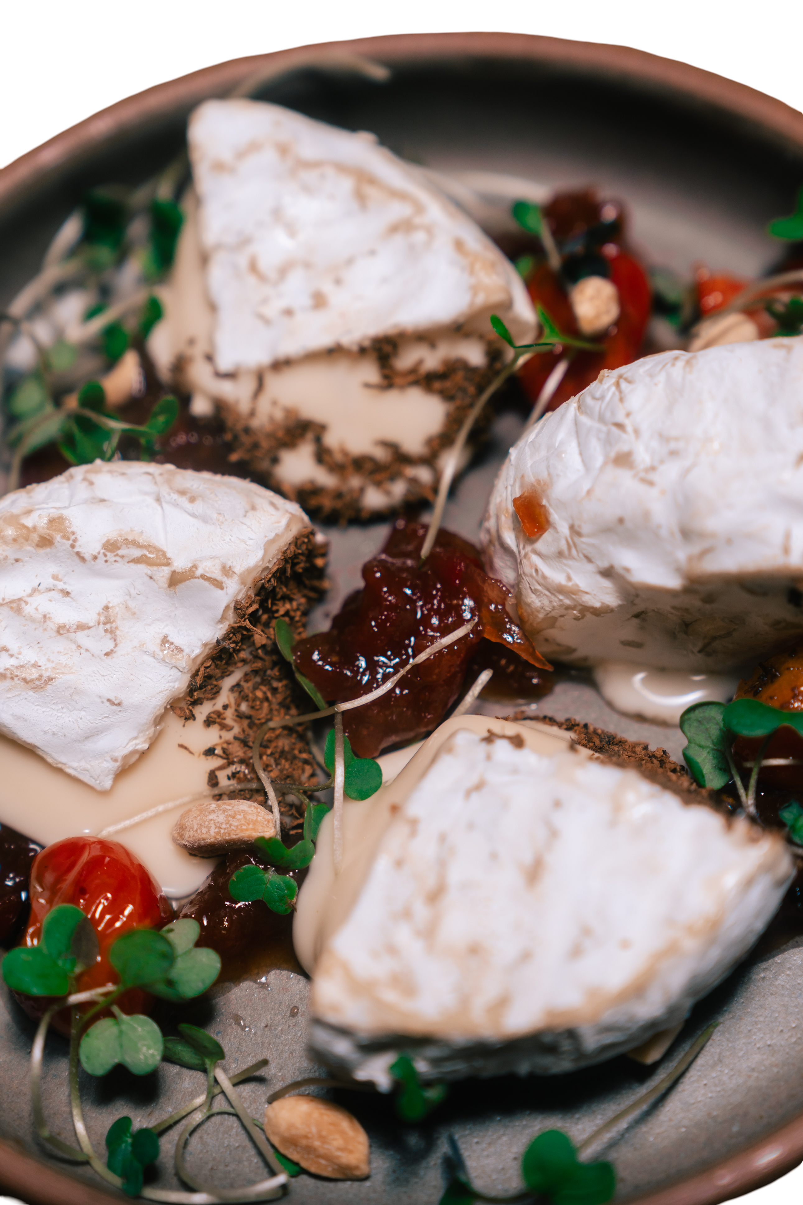 Camembert suave y fundente con polvo de hongos, mermelada de tomates orgánicos, tomates en textura, una combinación dulce y exquisita.