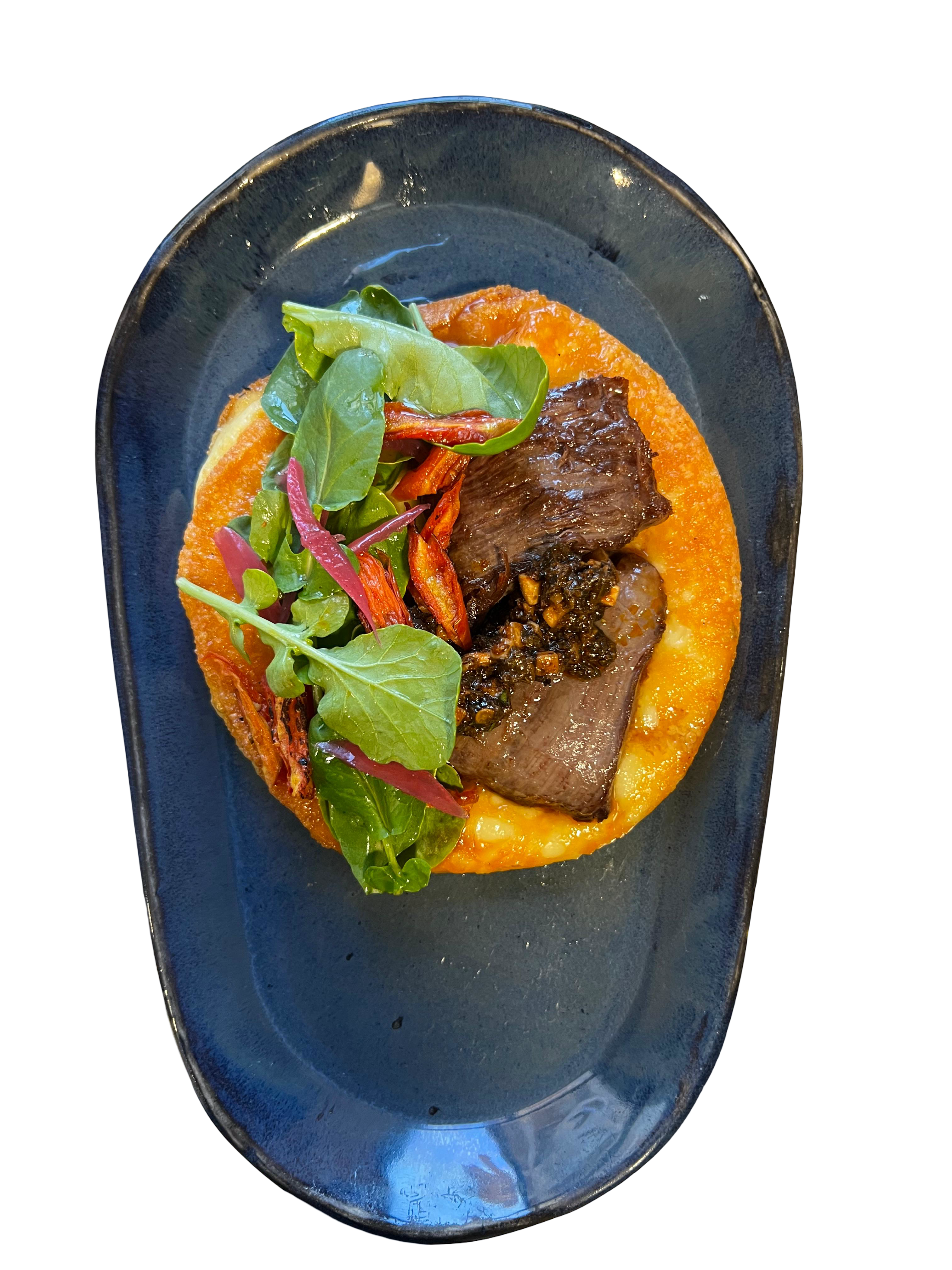 Provoleta fundida al gril, entraña jugosa y un chimichurri de hongos
